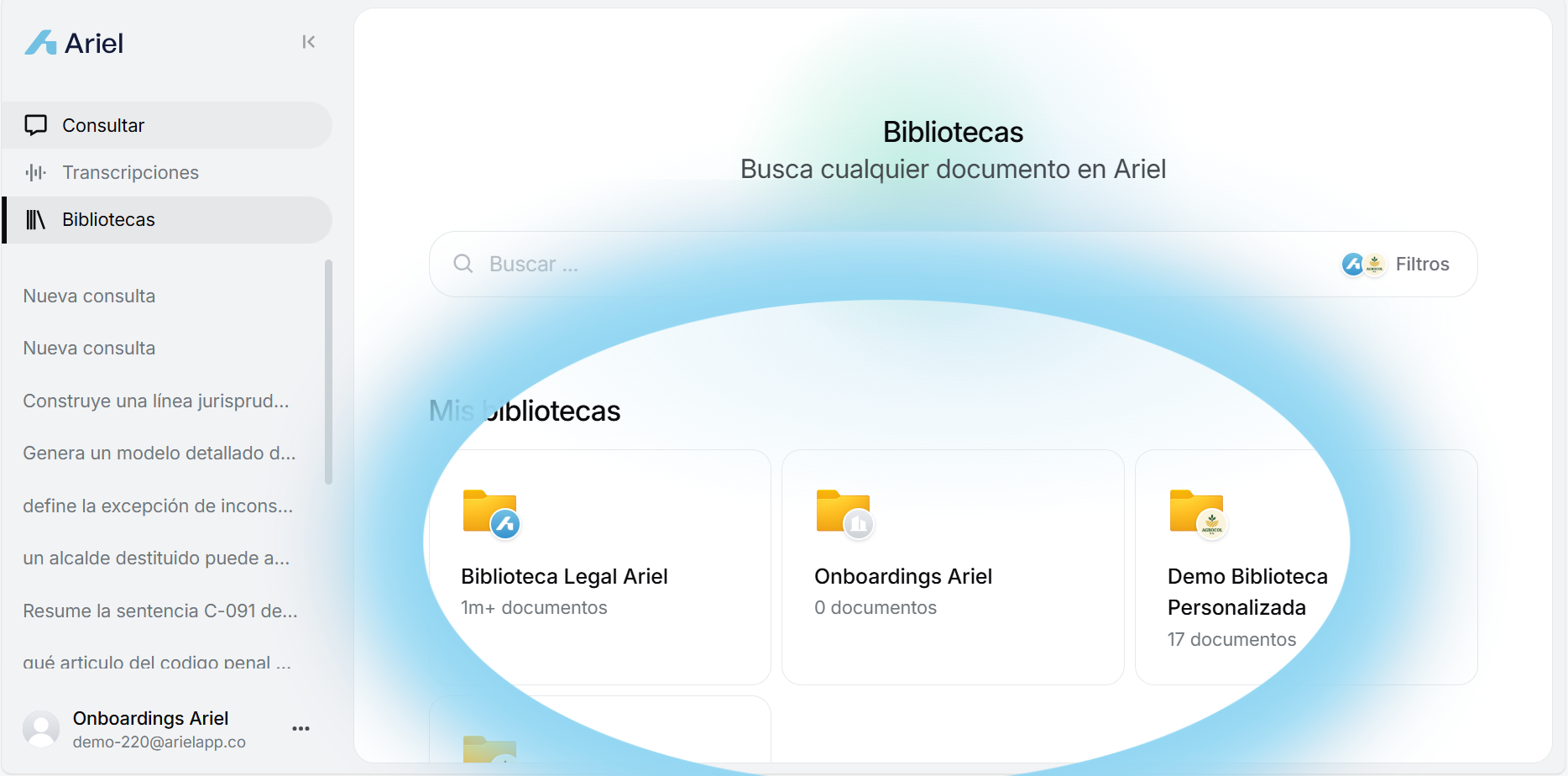 El módulo Bibliotecas es el espacio donde puedes consultar, explorar y descargar información jurídica organizada en un solo lugar. Aquí encontrarás códigos, leyes, decretos, jurisprudencia, información constitucional, tratados internacionales y demás información jurídicamente relevante que conforma la base de datos de Ariel.