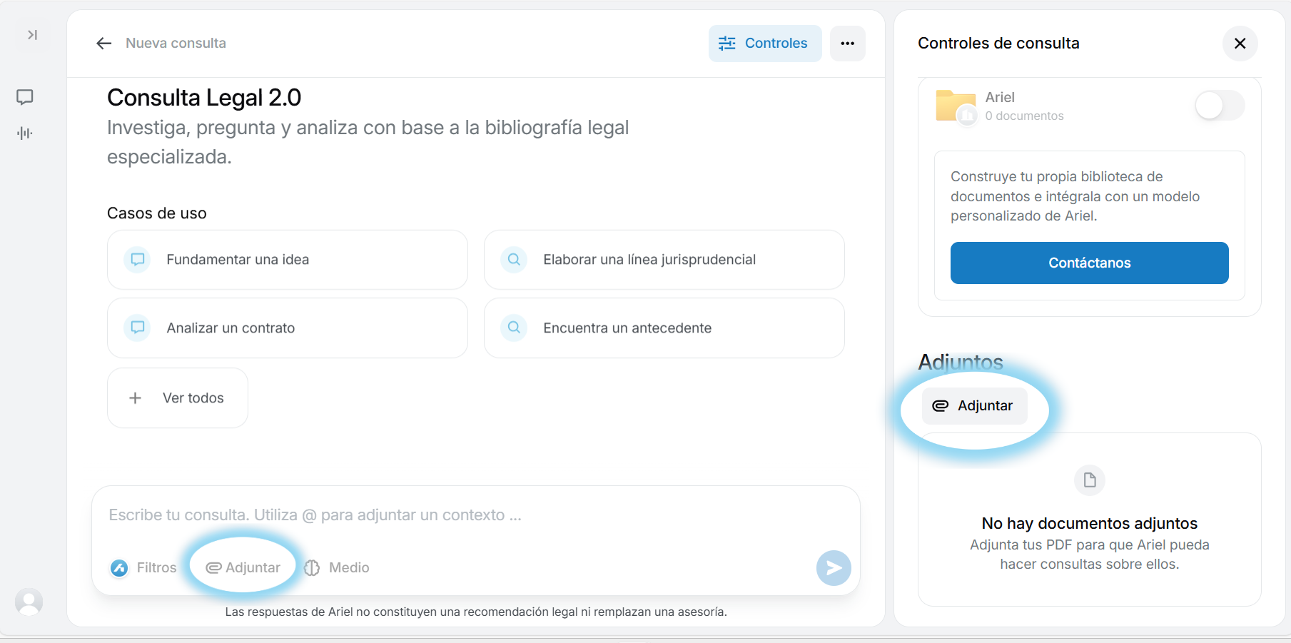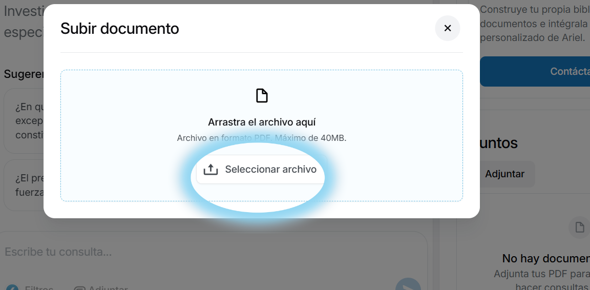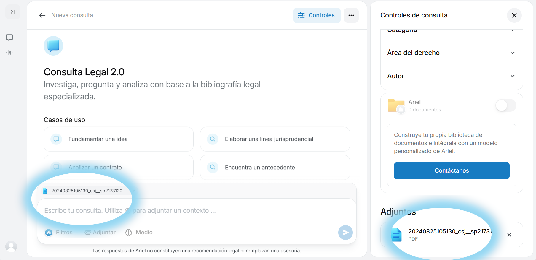 Al cargar un documento, Ariel lo vectoriza y es capaz de analizarlo. De esta manera, las respuestas estarán adaptadas tanto al contenido del archivo cargado como al conocimiento jurídico ya disponible en la base de datos de Ariel.