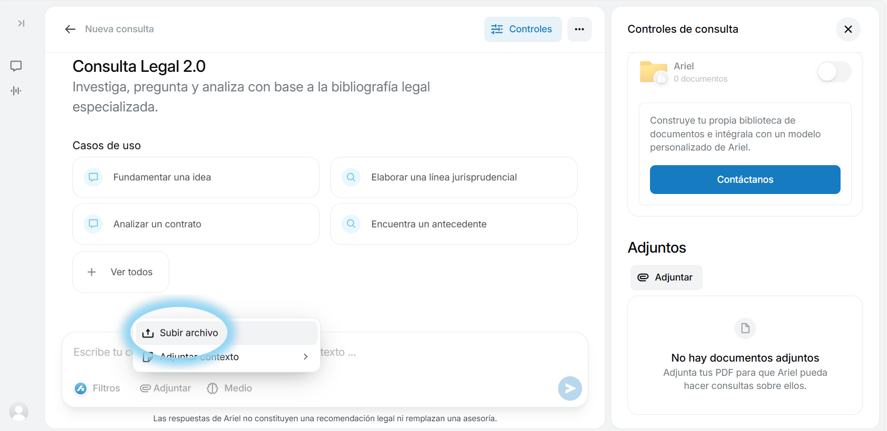 Al cargar un documento, Ariel lo vectoriza y es capaz de analizarlo. De esta manera, las respuestas estarán adaptadas tanto al contenido del archivo cargado como al conocimiento jurídico ya disponible en la base de datos de Ariel.