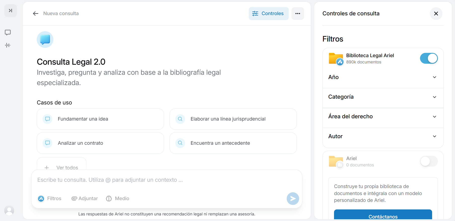 Con esta nueva herramienta, puedes indicarle a Ariel exactamente desde dónde quieres que obtenga la información: por años, categoría, área del derecho y autor.