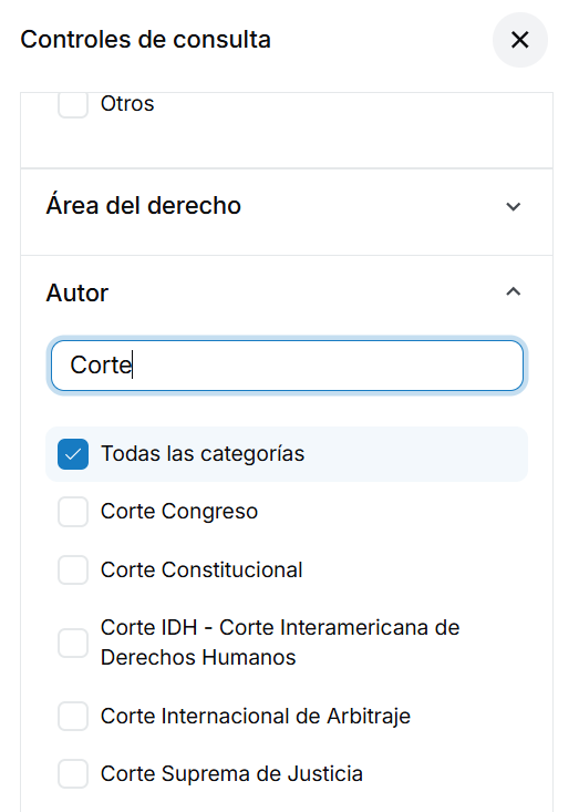 ✔️Por autor: Si lo que necesitas es información emitida por una entidad en particular, podrás filtrar directamente seleccionando uno o varios autores. Por ejemplo, puedes escoger a la Corte Constitucional, la ONU o ACNUR.